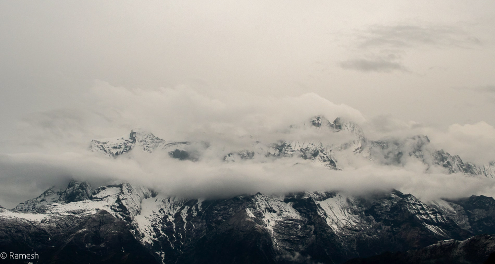 A grand, timeless master of rock and ice rises through a sea of shifting mist, standing as a silent guardian over the world below. In this corner of the Himalayas, the mountains do not just exist; they breathe, draped in a soft, white veil of clouds that dances around their jagged peaks like a sacred ritual.